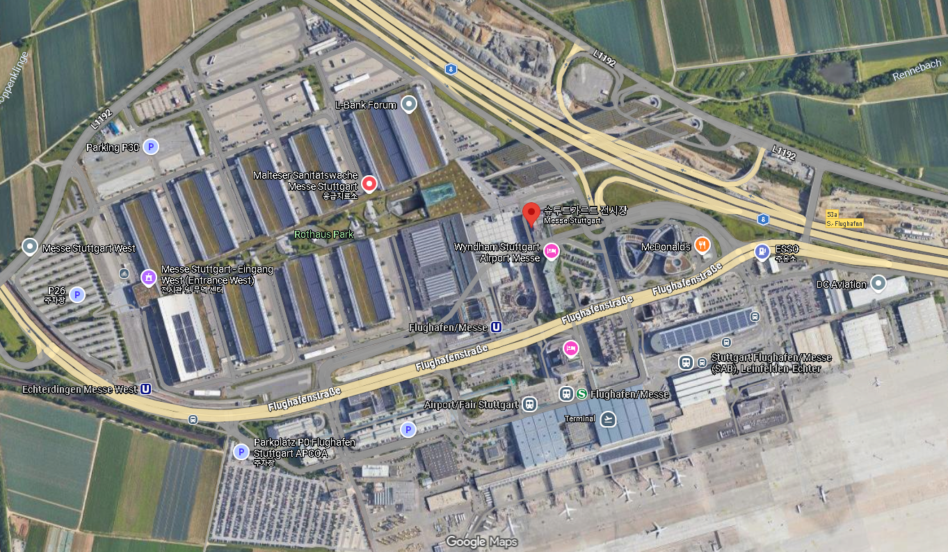 Messe Stuttgart의 가장 큰 무기는 뭐니 뭐니 해도 입지예요. 슈트트가르트 국제공항 바로 옆에 붙어 있어서, 비행기에서 내리자마자 전시장까지 이동하는 데 10분도 안 걸립니다. 처음엔 “설마 이렇게 가깝다고?” 싶었는데, 실제로 공항 터미널에서 나와서 전시장 표지판만 따라가면 바로 도착해요.